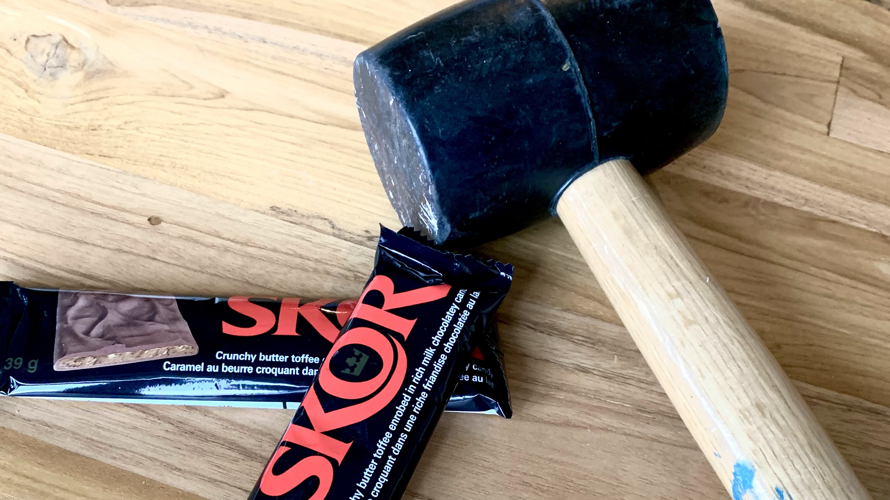 - You want about 1 1/2 cups of broken up candy. If you are using Heath or Daim bars, you might end up with some extra pieces. I’m sure you know what to do…
