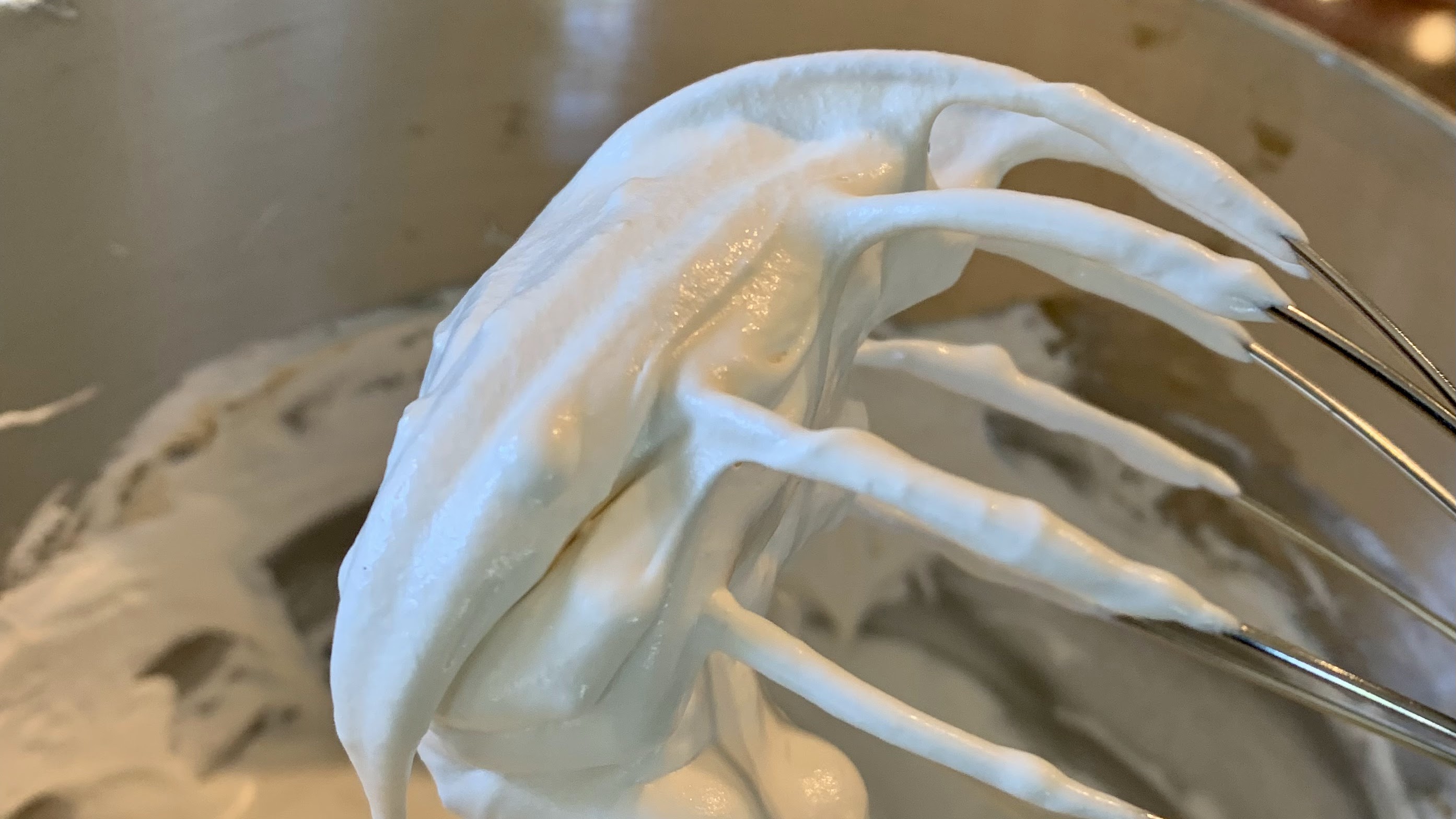 - Beat on medium-high for about 7-10 minutes until you have reached “stiff peak” stage (see notes)