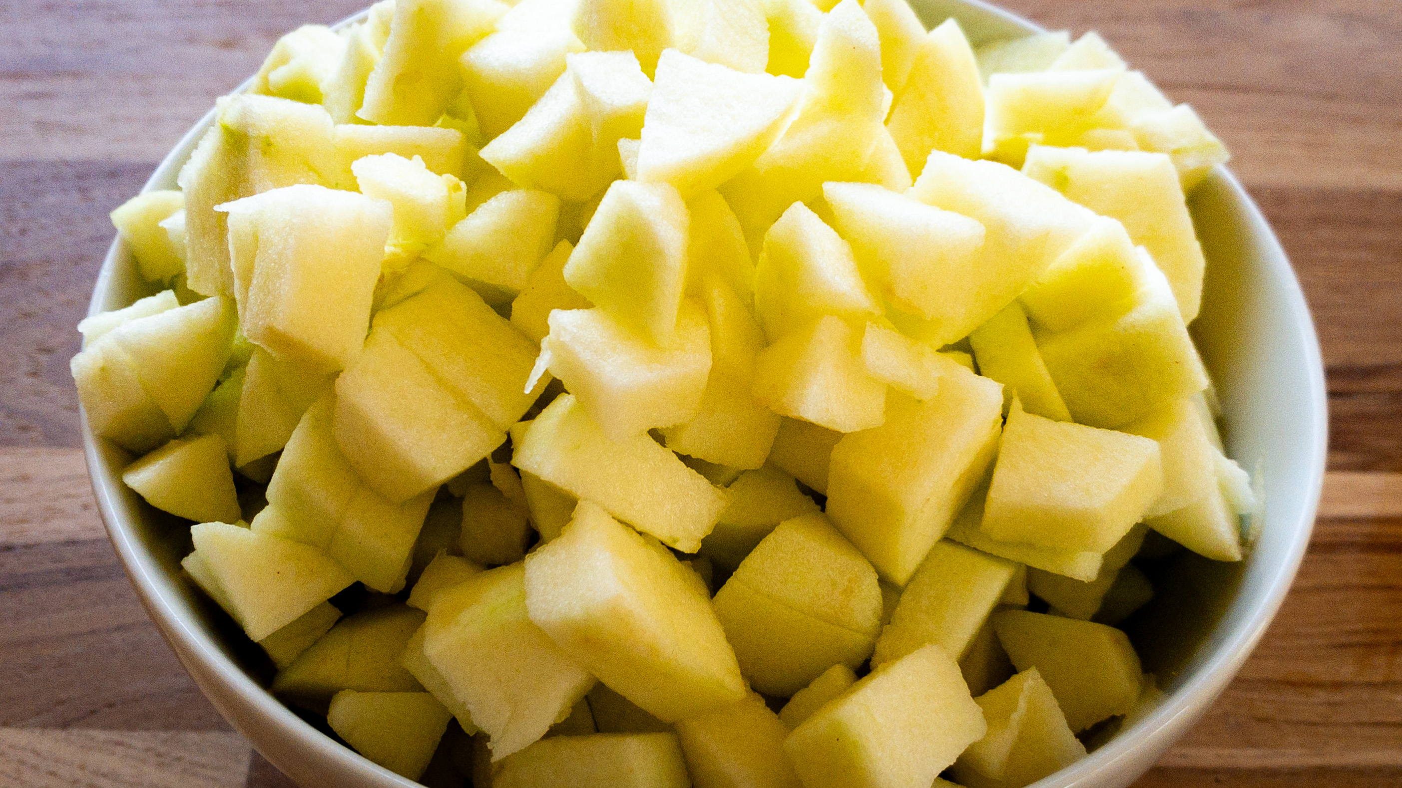 - Add the apples (5 chopped apples) and walnuts (1 cup) and stir together