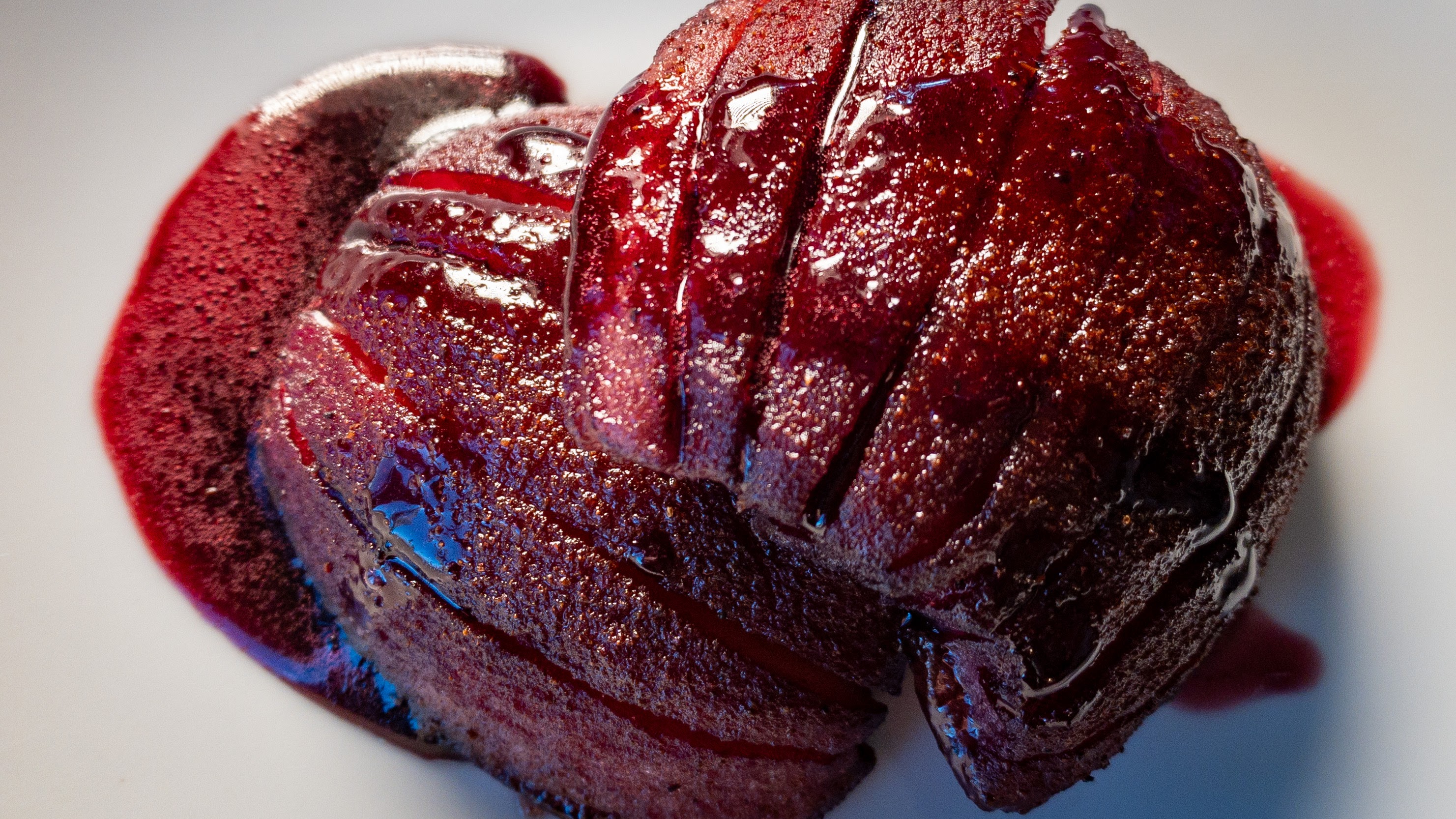 You might ask, what does one do with spiced red wine syrup? It is surprisingly versatile, and plays well with fruit, ice cream, cheesecake and even as a shock of colour and flavour in the filling between layers of cake.