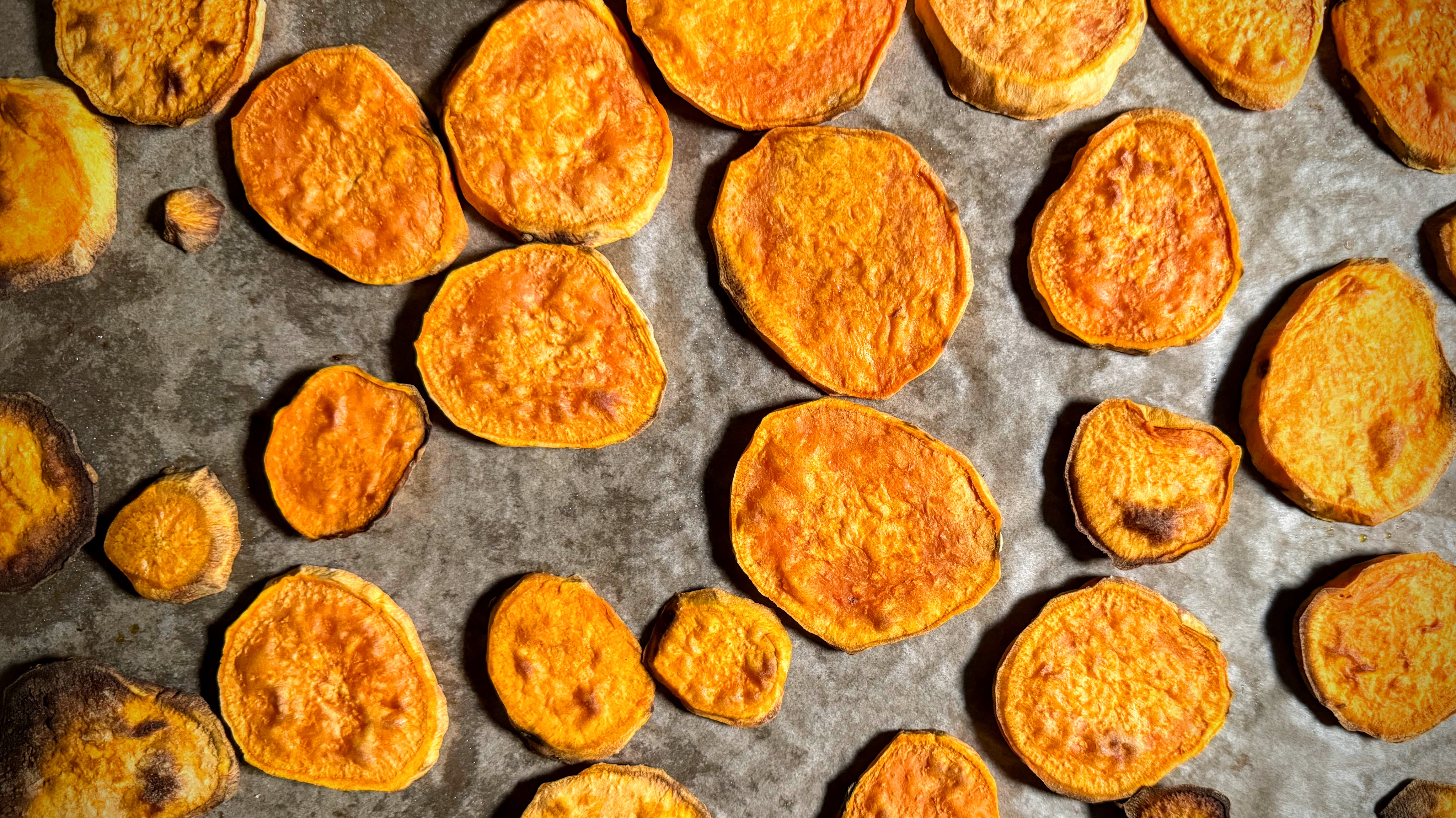- Spread sweet potato slices on cookie sheet and bake 20-25 minutes, until cooked through and slightly bronzed, flip halfway through baking
