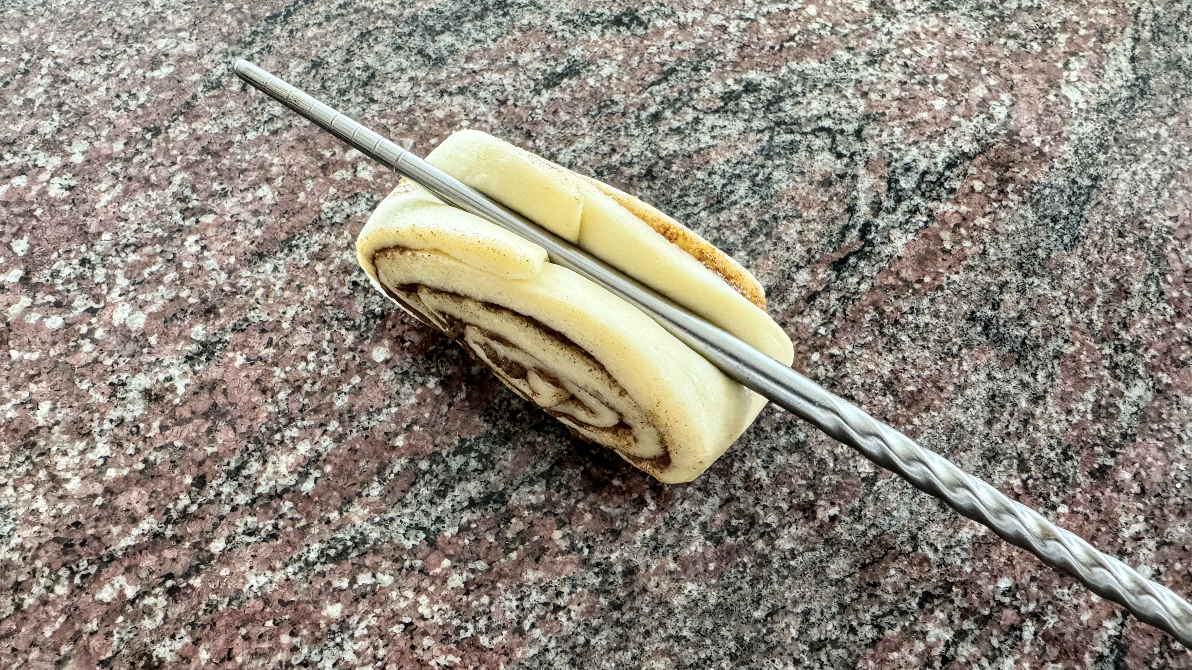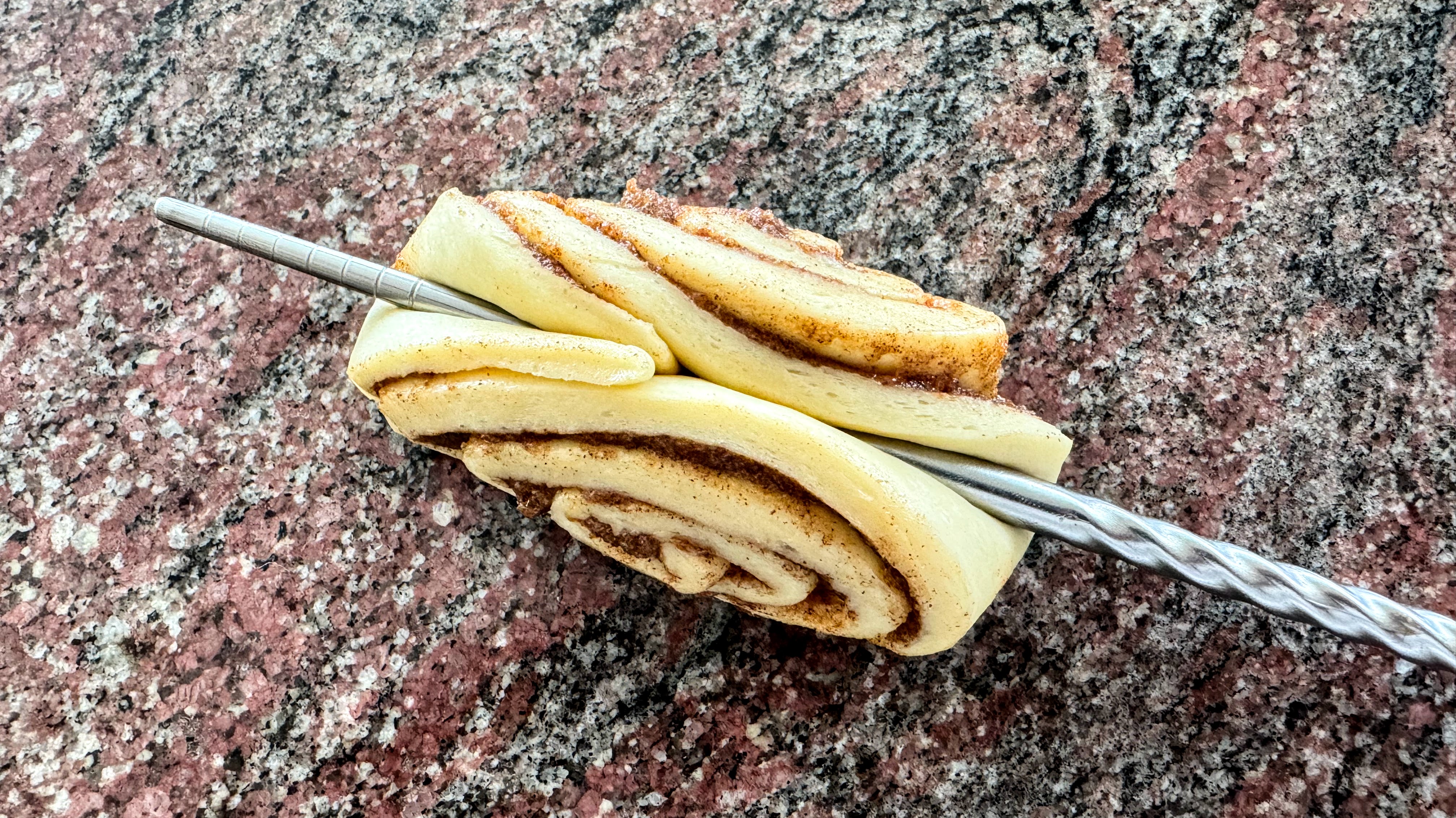 Step 1: Press chopstick into the bottom of the roll (seam side) parallel to the cut edges. Press hard but not so hard that you puncture the dough.