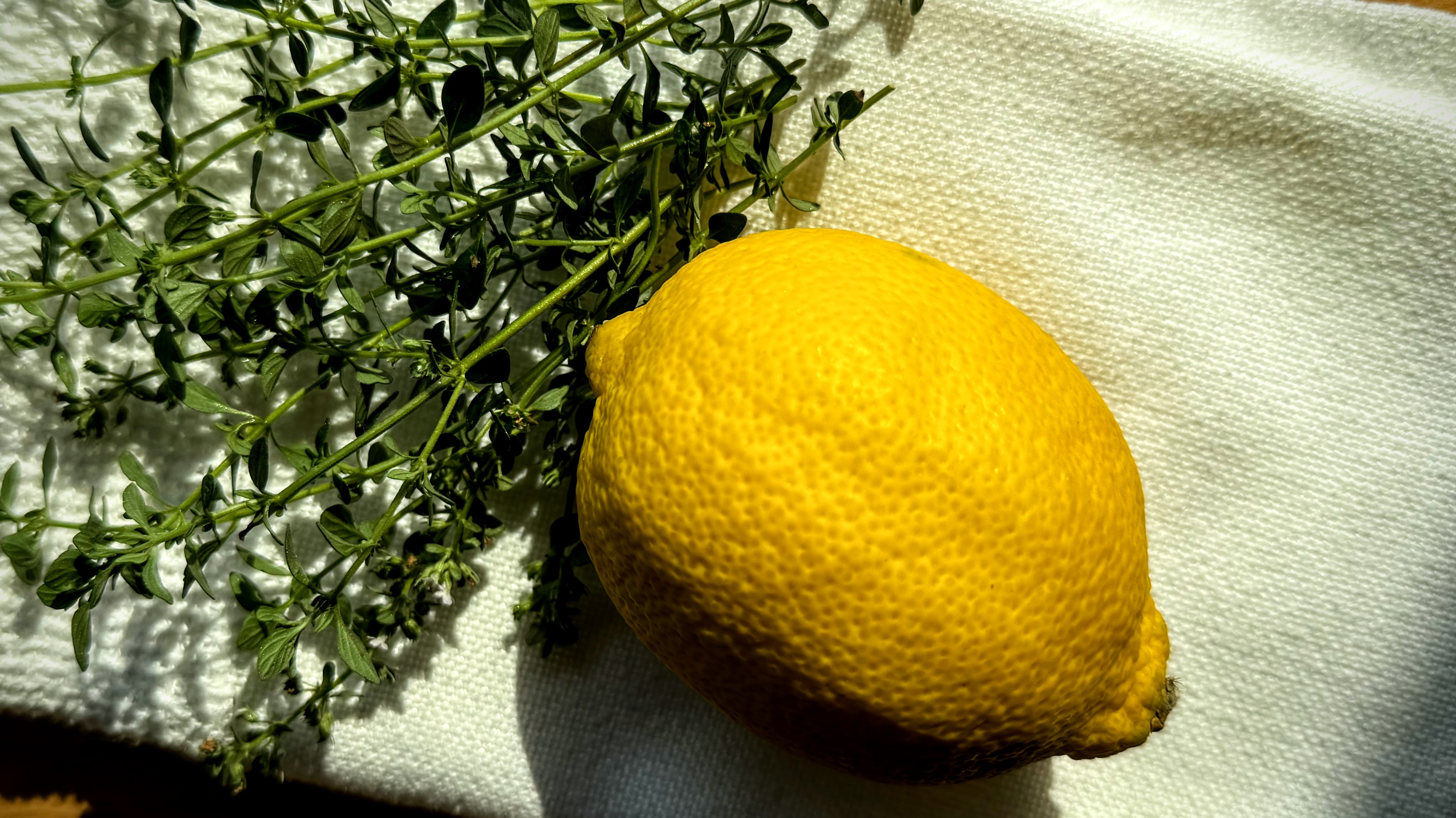 - Stir together flour (1 cup), sugar (1/4 cup), salt (1/2 tsp) and fresh thyme leaves (1 tsp)